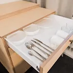 Jyväskylän majoituspaikassa on jaettu keittiö ja jaettu kylpyhuone.